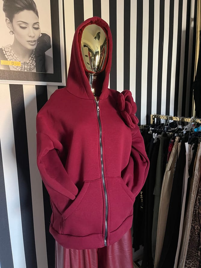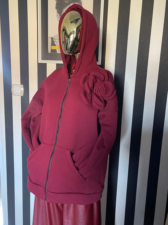 Bluza damska z ozdobną różą (odpinana) Kaptur Kieszenie Zamek błyskawiczny Kolor : Bordowy Rozmiar: Uniwersalny