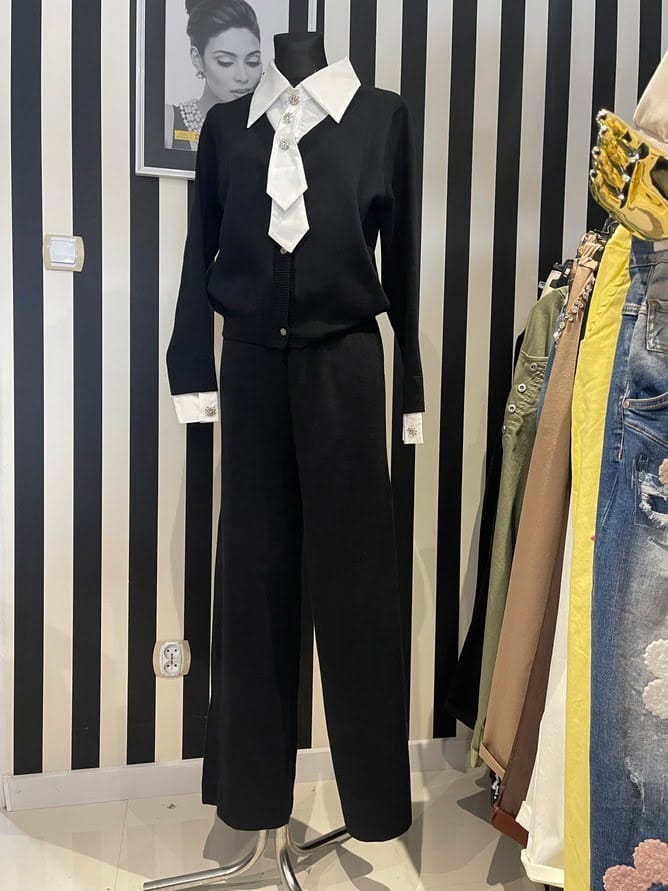 Elegancki komplet dzianinowy z ozdobnym kołnierzykiem Ozdobna aplikacja Zapinany na guziki Kolor Czarno – biały Rozmiar Uniwersalny