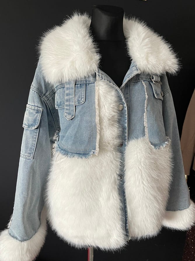 Kurtka Jeansowa Długie rękawy Kołnierz Sztuczne białe futerko Zapinane na guziki Kolor : Jasny niebieski Rozmiar : Uniwersalny do 120 cm w biuście