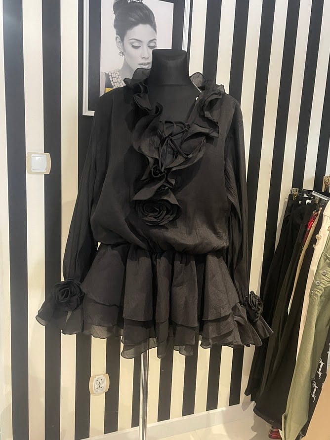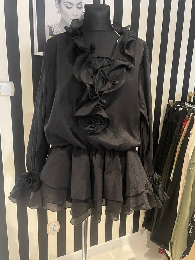 Tuniko sukienka z ozdobnymi falbanami Kwiaty 3D Wiązana Gumka w pasie Kolor Czarny Rozmiar Uniwersalny